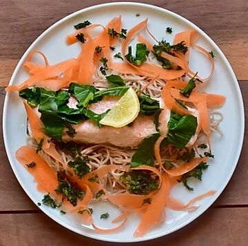 6. Serve noodles, carrots, salmon and parsley on a plate and drizzle with olive oil.