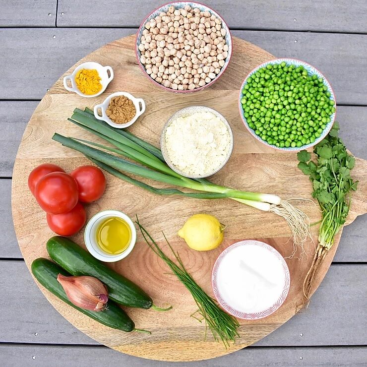 - Blend together, peas, chickpeas, spring onion, coriander and seasoning.